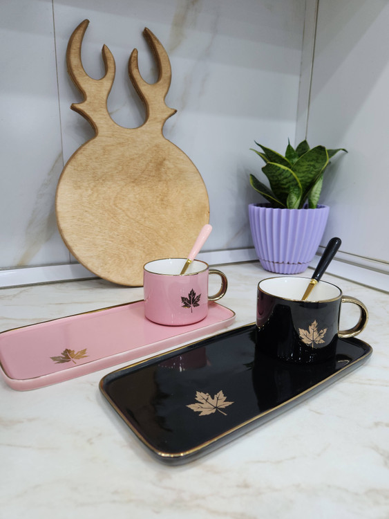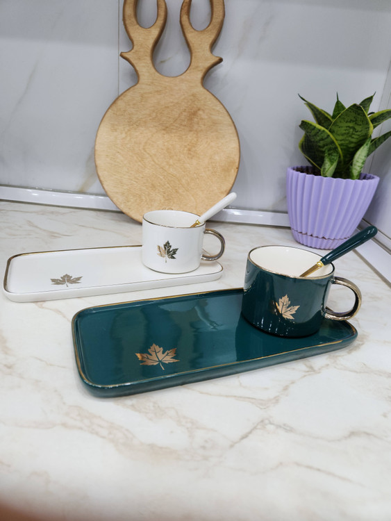 ماگ سرامیکی سینی دار وسیله ای شیک برای پذیرایی و کادو دادن می باشد. طرح روی ماگ و سینی برگ طلایی است. این محصول دارای یک قاشق طلایی رنگ با دسته سرامیکی همرنگ ماگ و سینی است. در 4 رنگ مطابق با تصاویر موجود می باشد.
